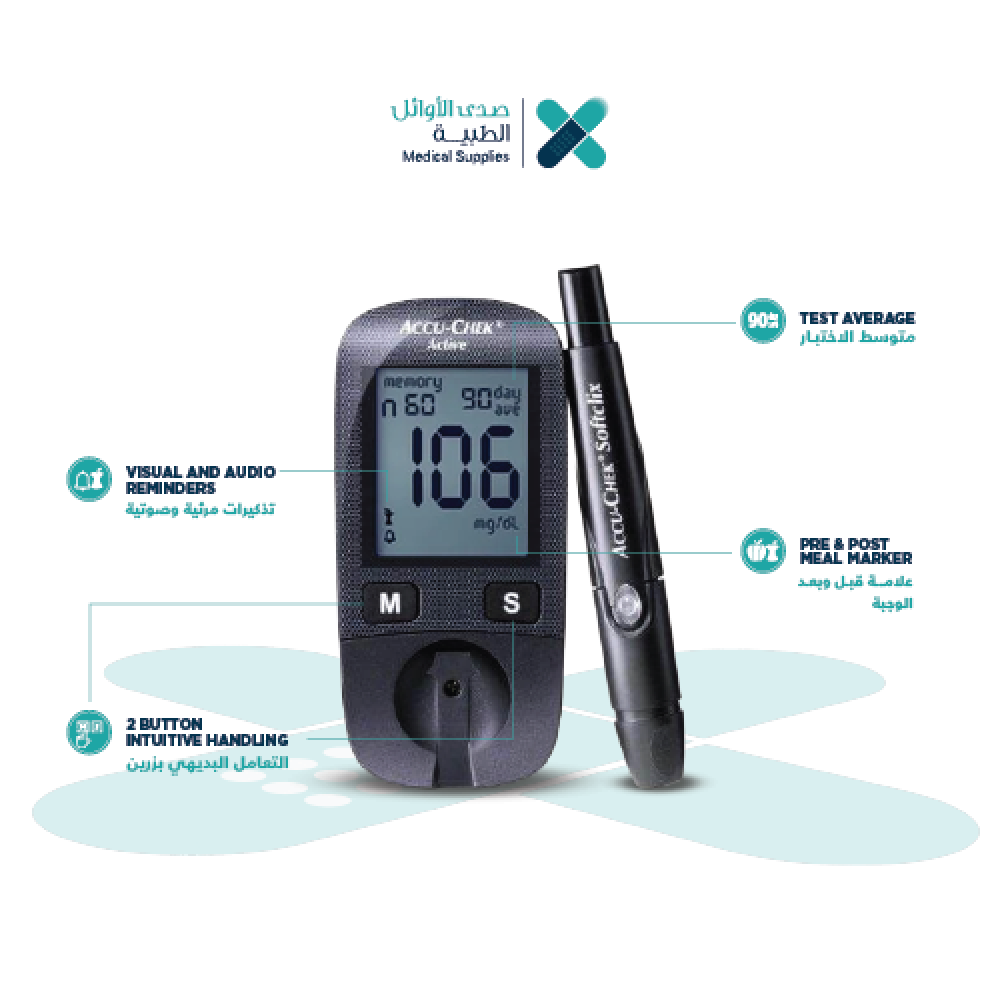 - جهاز Accu-Chek Active – قلم وخز – شرائط – إبر – كتيب الاستخدام.